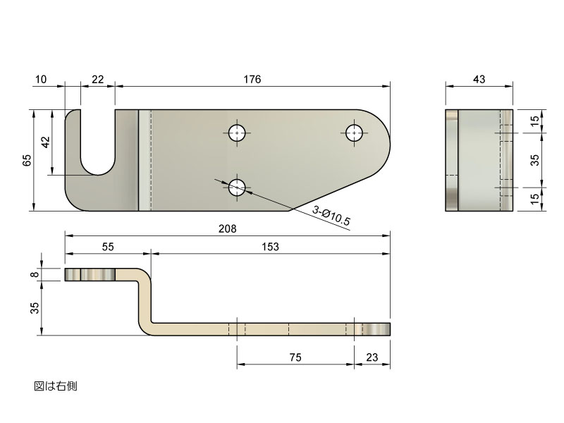 寸法:8x65x208 35mm段付 3-Φ10.5穴付
