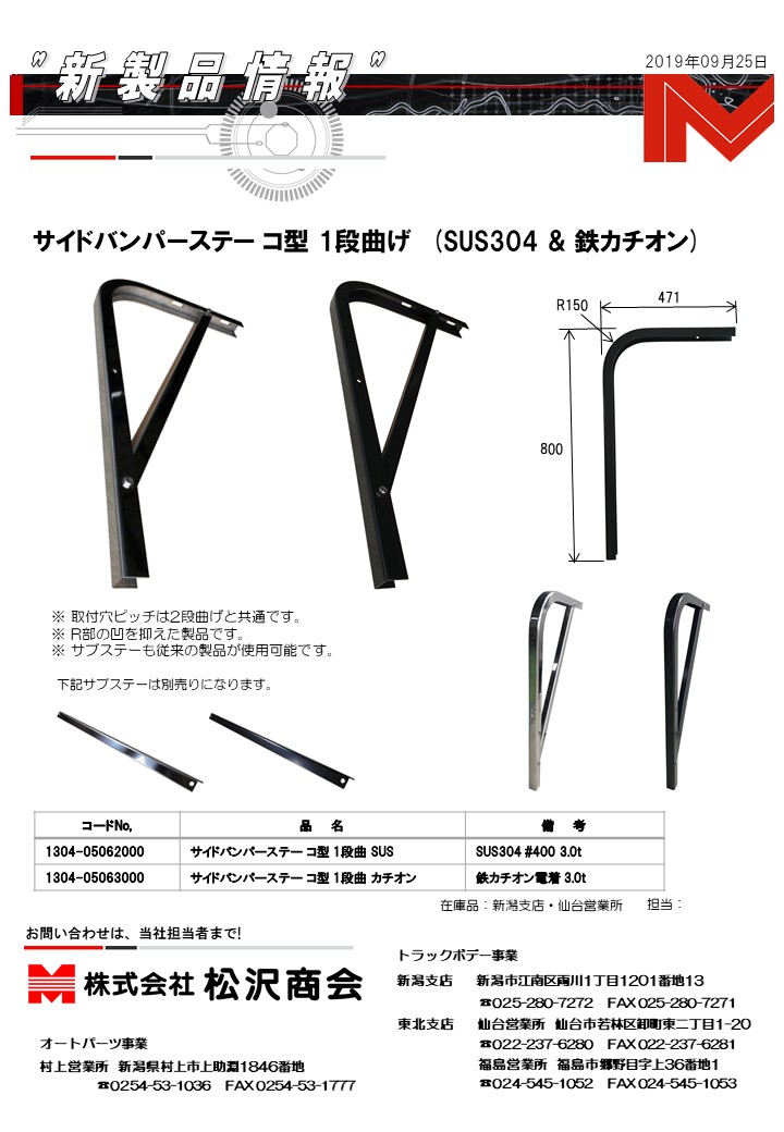 サイドバンパーステーのラインナップに、コ型1段曲H=650ステンレスを追加しました。主に4t車・大型低床車への使用の場合、通常品(H=800)に比べ材料ロスを出来るだけ押えた製品です。サブステー(補強ステー)は別売です。左右共通品です。