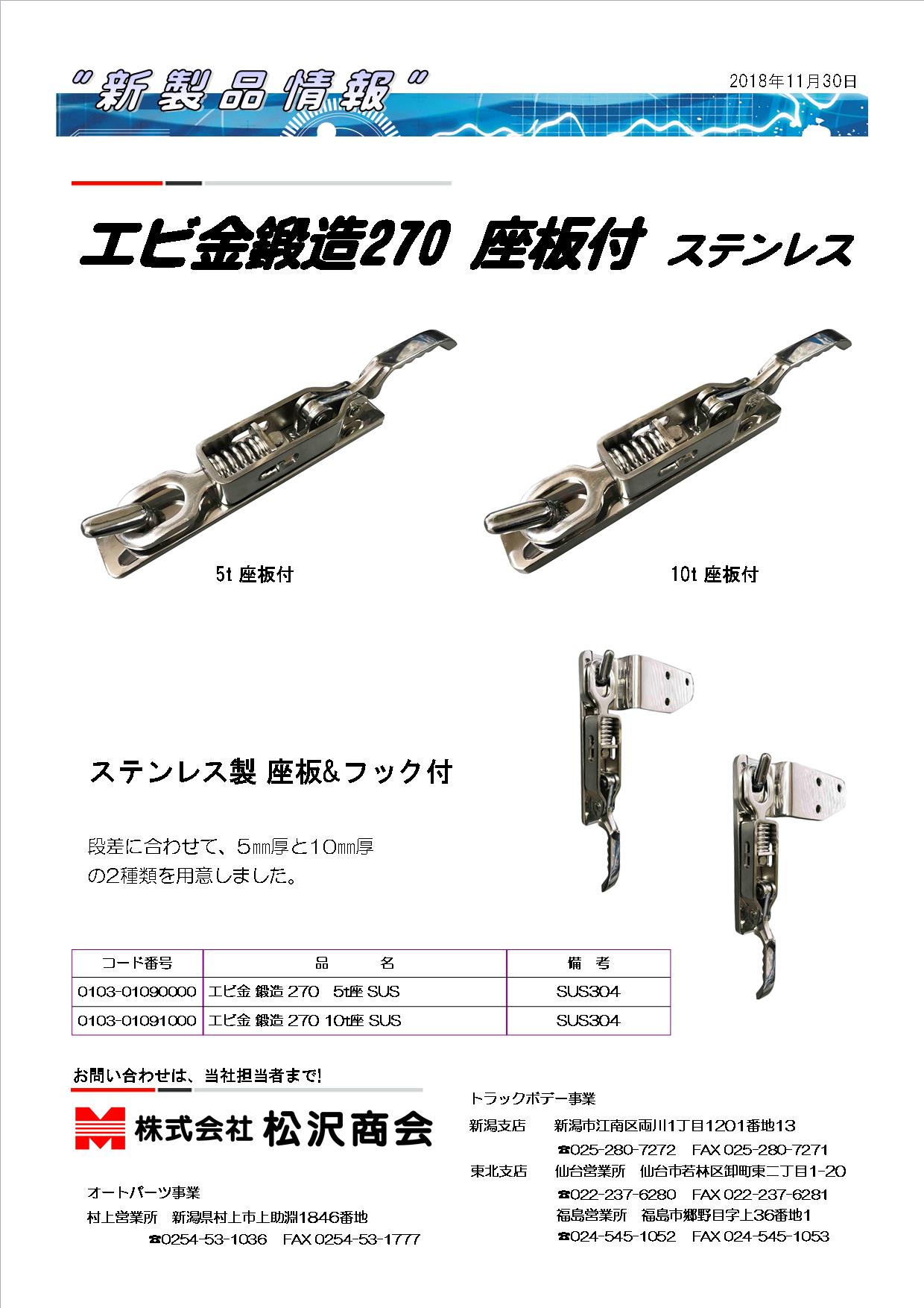 エビ金鍛造270ステンレスにフック受と座板を取付した商品です。それぞれの取付の手間を省き、工数を削減できます。座板厚みは5㎜厚と10㎜厚の2アイテム、ステンレスSUS304 研磨品です。