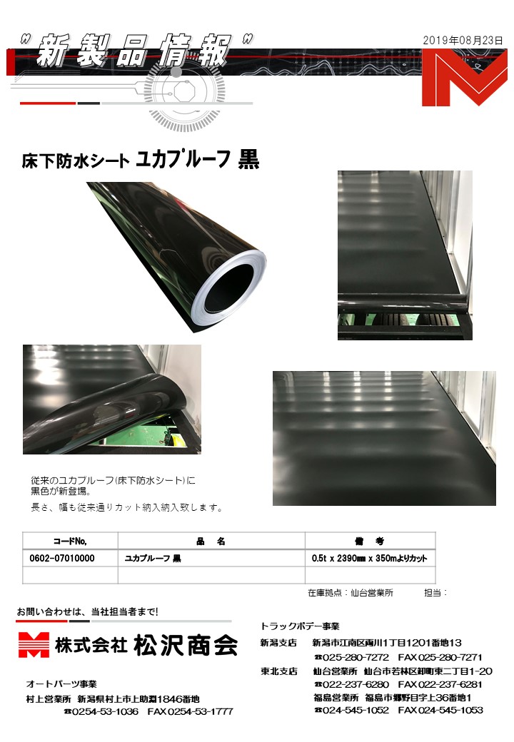 床下防水シート「ユカプルーフ」にブラックタイプ「ユカプルーフ黒」の販売を開始しました。一枚物で床下からの水上がりを防ぐ事ができ、工数削減と軽量化が可能です。従来通り原反サイズ0.5tx2390x350mより指定寸法(幅2390mm以下x長さ100m以下)にカット納入致します。