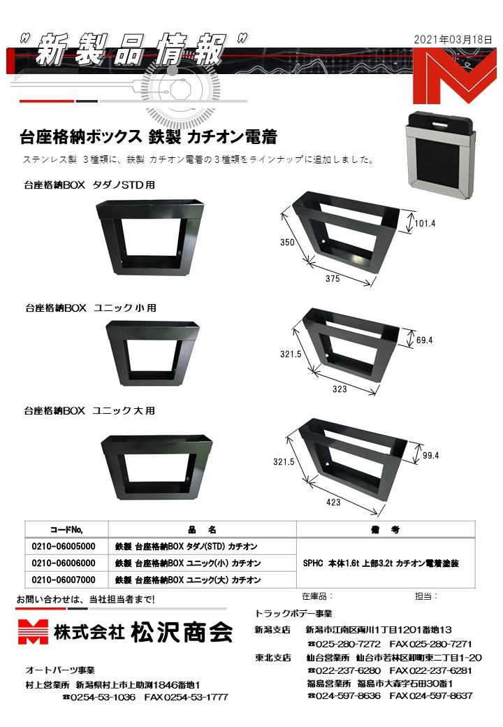 クレーン付き車輌などの鳥居取付の物入です。サイズは幅500mmと600mmの2種類、奥行き高さは両サイズ共に350mmです。在庫品なので設計・納期の短縮が出来ます。光沢アルミ縞板材を使用しているので美しく軽量です。他収納ボックスの用途にもご使用下さい。